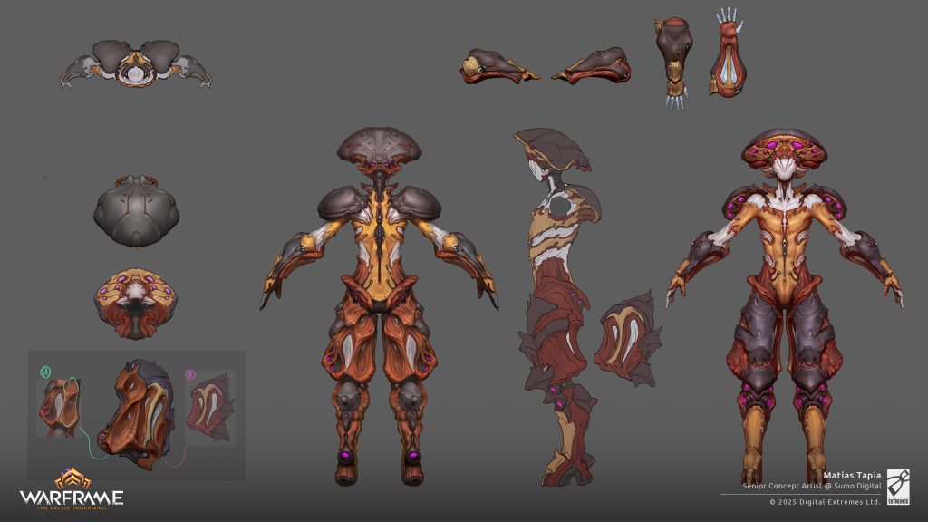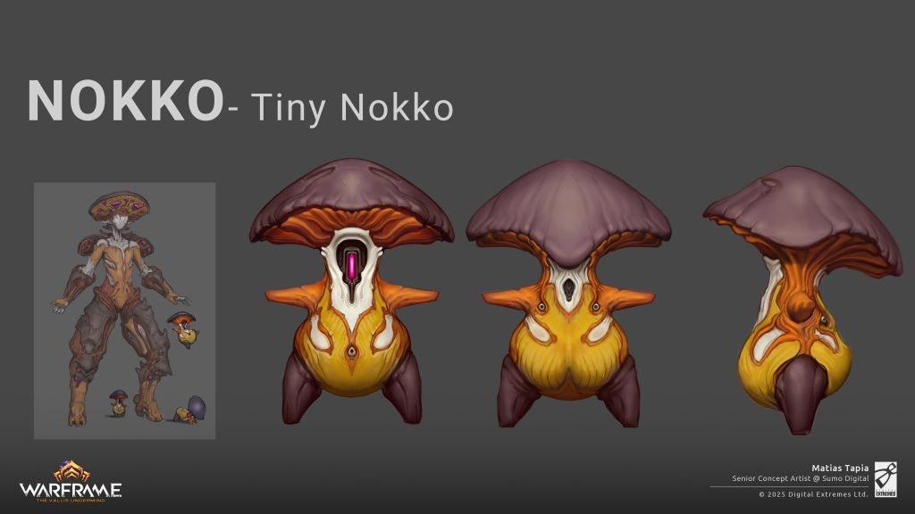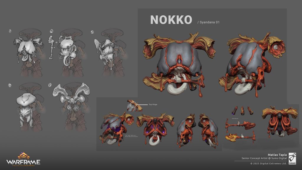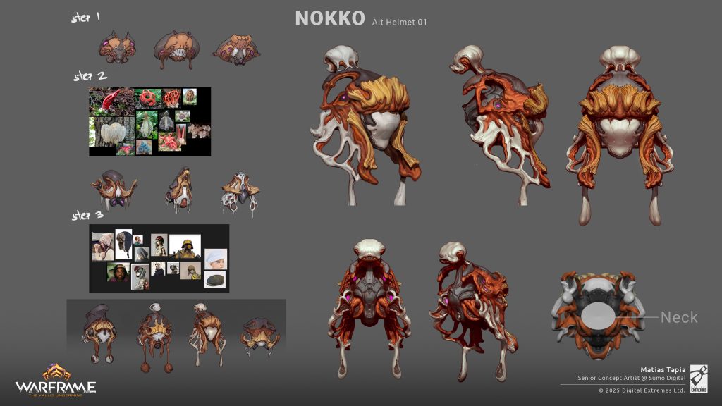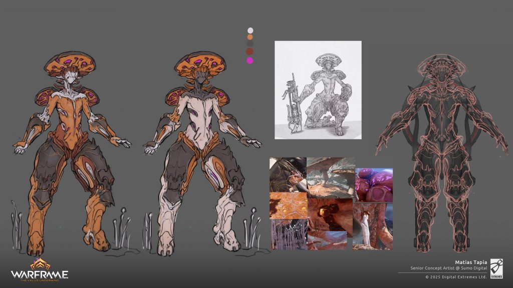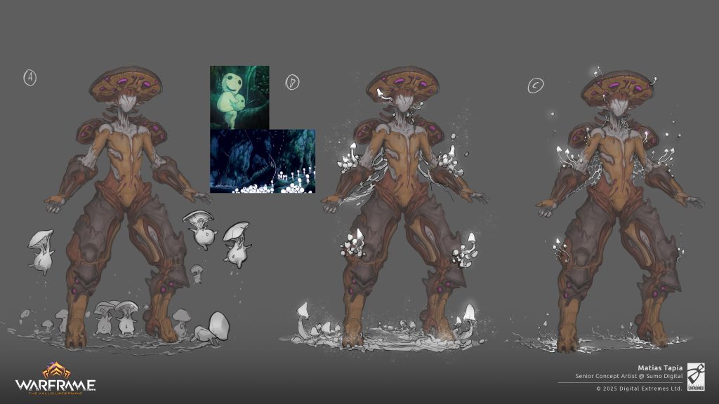 Throughout the character design process of Nokko, the concept team took to the books to refresh their knowledge of fungi, with King Trumpet and Oyster mushrooms being the main inspirations for Nokko’s design. Matias gives us a further insight into this, “It was not entirely an unfamiliar subject. Mushrooms are interesting! But in this case building any kind of reference library was about trying to adhere to the way Warframe’s are built in terms of material separation. So, it all had to be mushrooms, but also, they all had to be different enough from each other.”