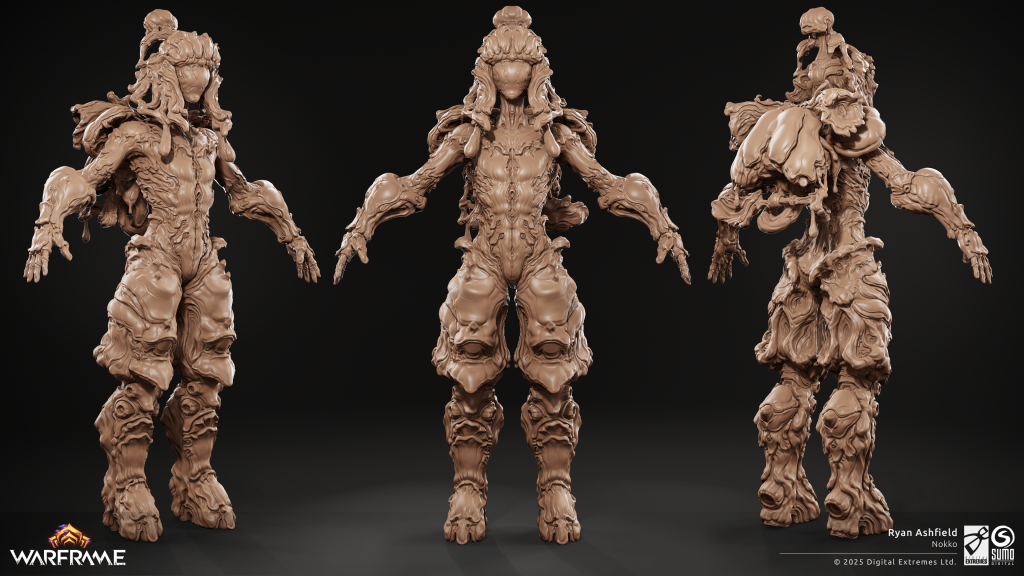 “More changes came later from Ryan Ashfield (Senior Character Artist) working closely with Stephen to keep it consistent with Nokko. This consistency was incredibly important, since it later gave birth to the idea of making this ephemera into a main feature for the Warframe, his powers and his quest.”