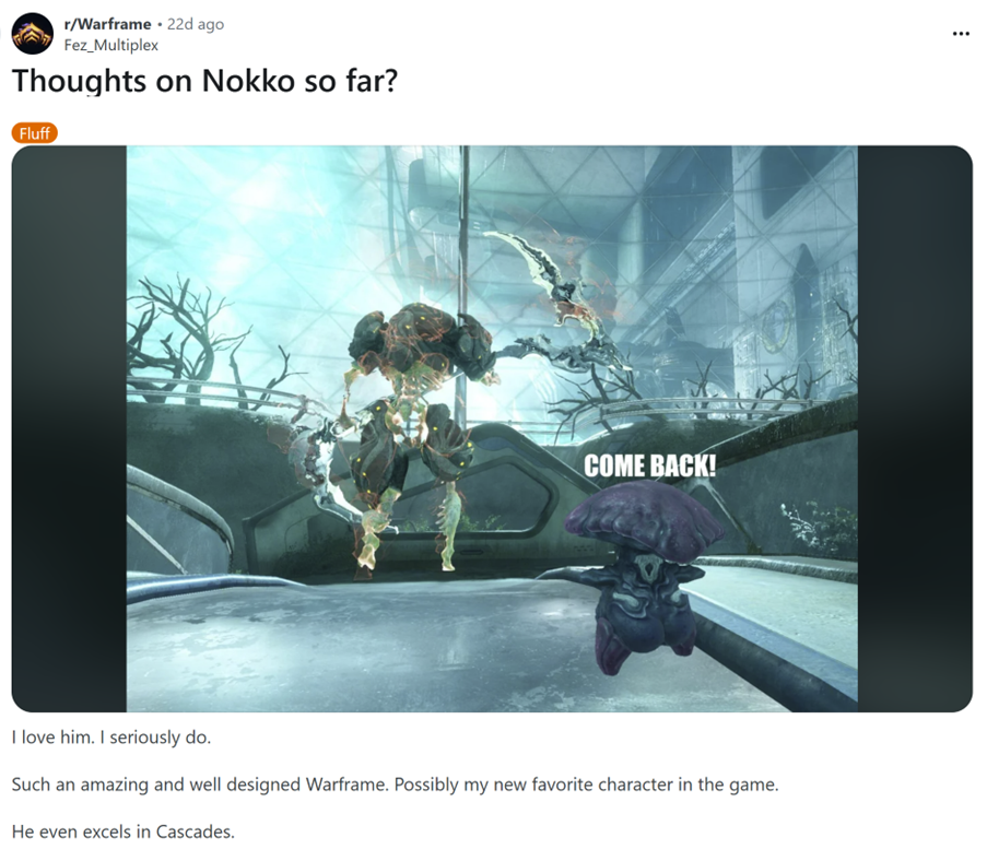 Player comments on the r/Warframe subreddit, discussing thoughts on the Nokko Warframe