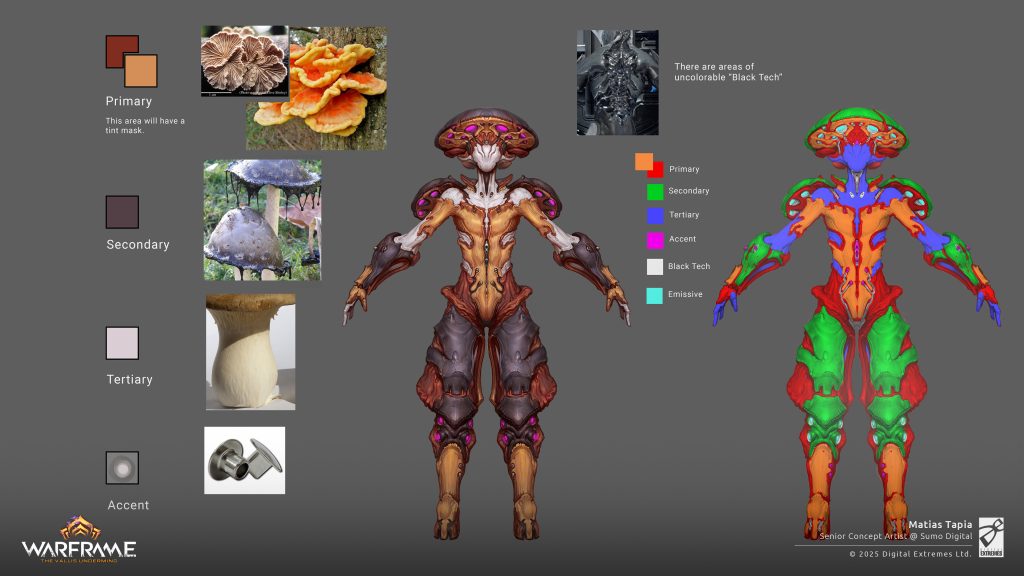 “After creating the Citrine Aphrodita Deluxe Skin Bundle for Warframe’s Isleweaver update, we learned that it was best to identify and define materials early on. So, we concentrated on creating a comprehensive material sheet that gave each material their own language matching to visual references that would reflect Nokko’s natural mushroom-y nature.